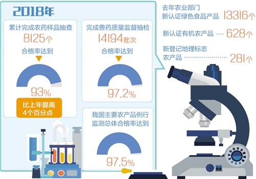 “标准是农产品质量安全的基础支撑。”中国工程院院士、食品科学检测技术学专家庞国芳说,业内评价一个国家农产品质量安全水平,首先看上市的农产品是否符合食用农产品安全标准。农业农村部数据显示,2018年我国新制定农残限量标准2967项,完成兽药残留限量标准清理,新制定兽残标准643项。