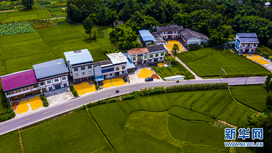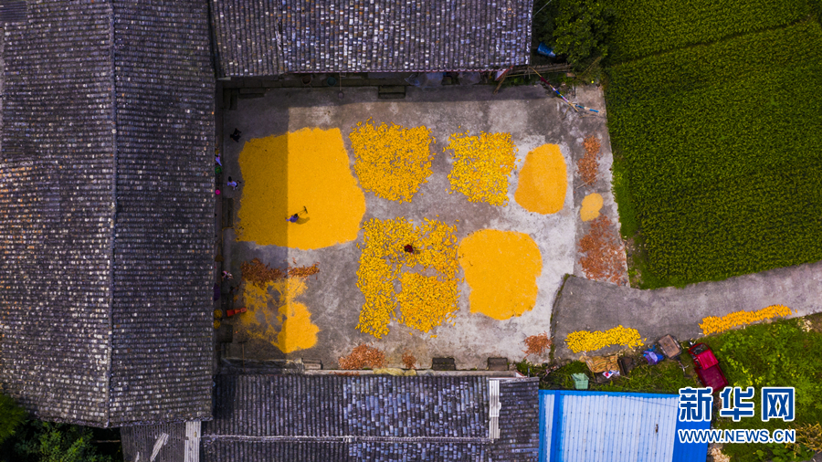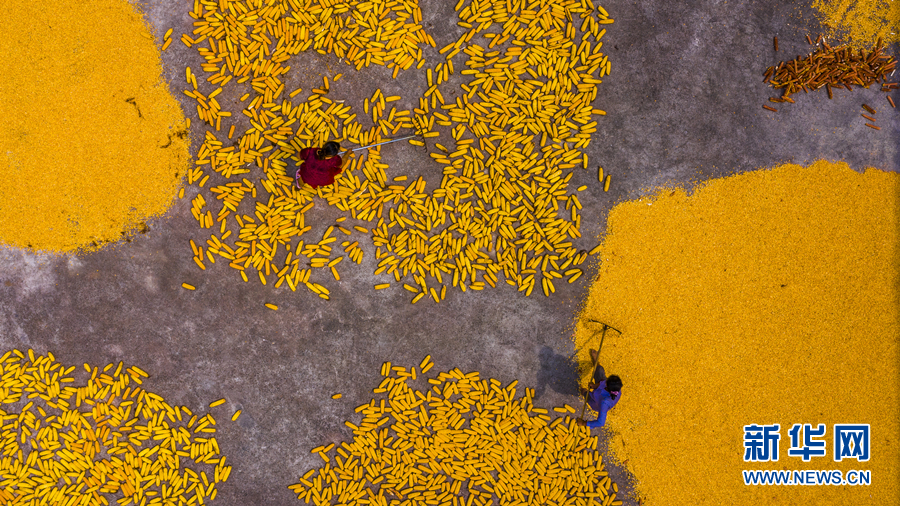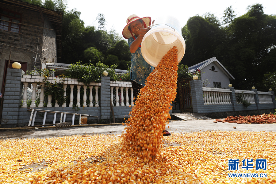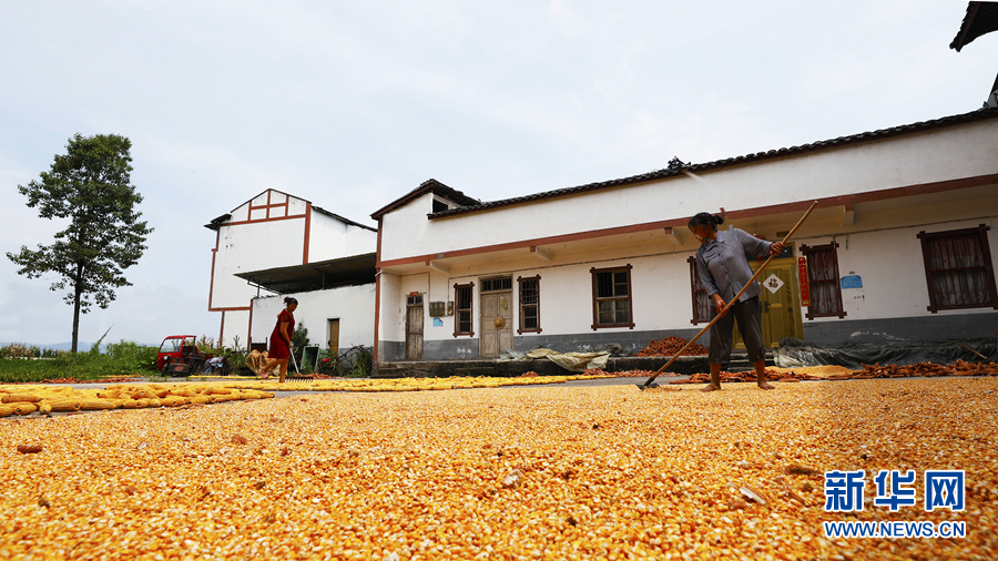 当前正值玉米收获季节,近日,重庆市梁平区的农民抢收、晾晒玉米,家家户户一片忙碌景象。近年来,梁平区农业农村委、区科协积极引导农户种植优良玉米品种,农业技术员进村入户指导农民适时播种、合理施肥、扎实做好田间管理,玉米连年喜获丰收。在盛夏的阳光下,金灿灿的玉米晒出了农民增收的喜悦。新华网发(高小华 摄)