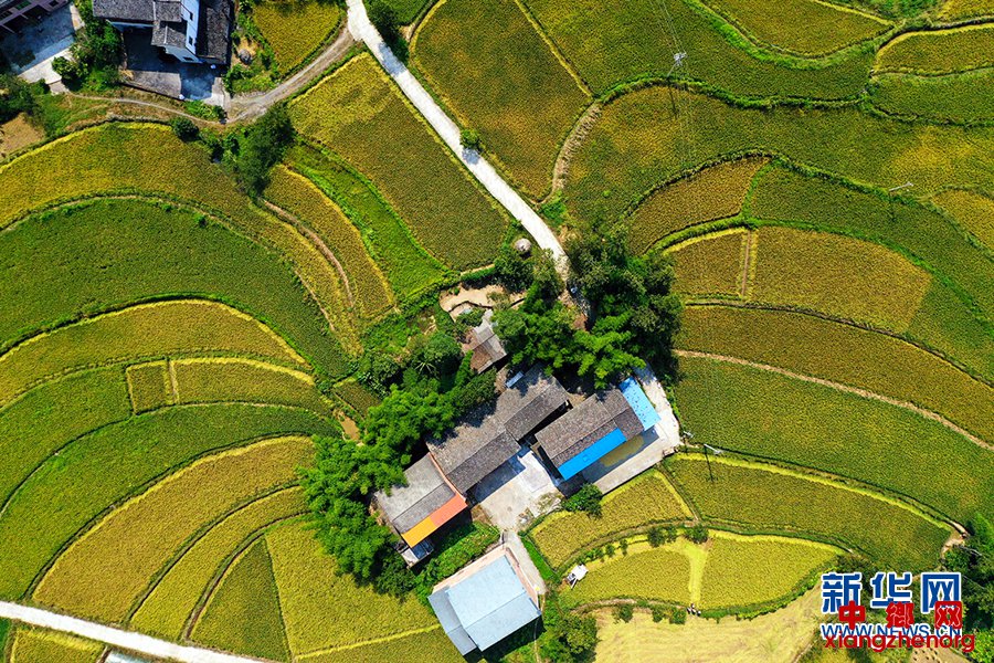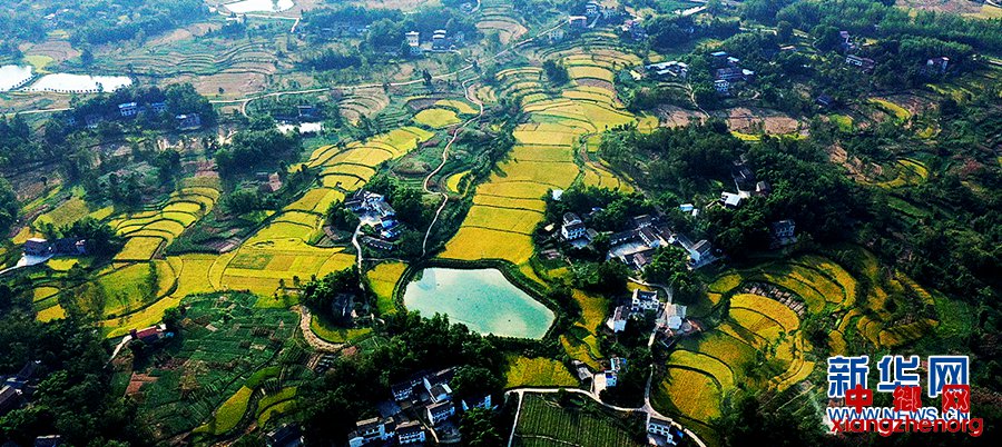 8月19日,星罗棋布的村落、泛着清波的鱼塘、纵横交错的道路、郁郁葱葱的树木与金色的稻田相互映衬,构成一幅秋收画卷。新华网 彭博 摄 飞手:郑杰