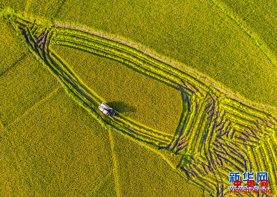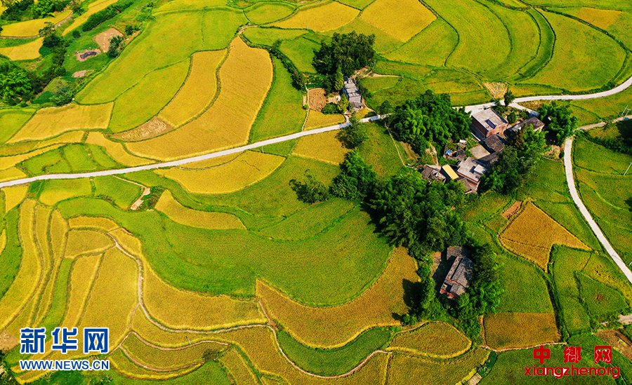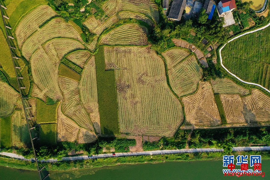 8月19日,收割后的稻田宛如五线谱,演奏着巴渝农村增收致富的乐章。新华网 彭博 摄 飞手:郑杰
