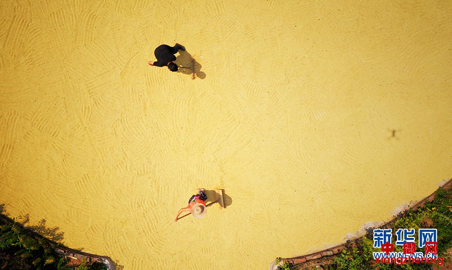 8月19日,农民们正趁着晴好天气,晾晒新稻,在劳动中享受着丰收的喜悦。新华网 彭博 摄 飞手:郑杰