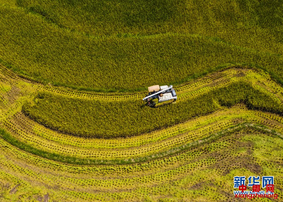 8月13日,收割机正在重庆市梁平区仁贤镇五一村收割水稻,奏响丰收曲。新华网发(高小华 摄)