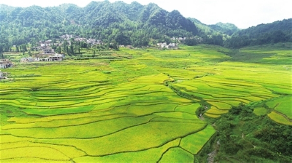 初秋时节,在长顺大地,9.8万亩水稻抽穗扬花丰收在即,金灿灿的稻穗,在山野田间勾勒出一幅幅五彩斑斓的美丽画卷。在长顺县广顺镇新寨社区村村寨寨,远远望去,依山而造的梯田,一层层从山脚盘绕到山顶,随着山势的起伏,犹如一件件金色衣裳,如诗如画,美不胜收。(田华华)