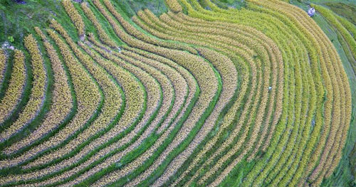 这是9月17日无人机拍摄的贵州省榕江县计划乡计划村阳开苗寨梯田。 近日,贵州省黔东南苗族侗族自治州榕江县计划乡计划村阳开苗寨的水稻陆续成熟,农民们抢抓农时收割稻谷。从空中俯瞰,层层叠叠的梯田线条分明,与古朴的苗寨木楼相互映衬,美不胜收。 新华社记者 杨文斌 摄