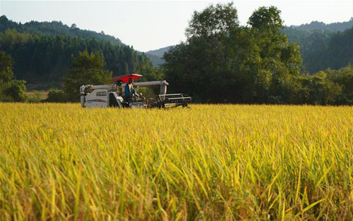 9月25日,黎川县荷源乡的村民驾驶收割机在稻田里劳作。 金秋之际,江西省黎川县16.3万亩晚稻迎来收获季。当地农民抓住农时,忙碌在金色稻田中。 新华社记者 胡晨欢 摄