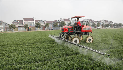 2月12日,河南省平顶山市宝丰县赵庄镇袁庄村村民驾驶农业机械为麦田喷洒除草剂。 眼下正值春耕备耕时节,各地在做好疫情防控的同时,采取多种措施保障春耕物资的运输,引导农民抢抓农时,积极投入春耕备耕生产,为全年农业生产夯实基础。 新华社发(何五昌 摄)
