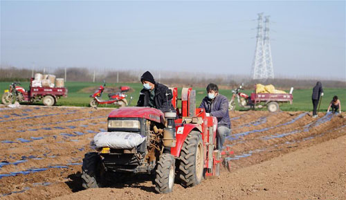 2月16日,在西安市长安区大兆街办庞留村,农民在操作播种机播种土豆。 春耕时节,陕西省西安市长安区的农民在做好疫情防控的同时,紧抓农时,积极开展春耕生产。 新华社记者 邵瑞 摄