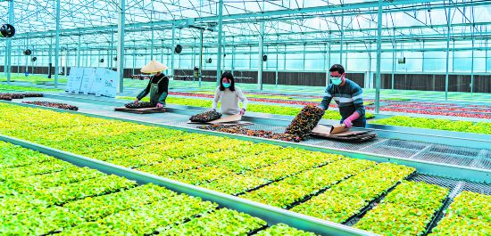 走进惠美花境的育苗大棚,第一个感觉就是——好大!温室内密密麻麻摆满了育苗温床,满目一片绿色。大棚内的一个区域,几名工作人员正在将一盘盘穴盘苗装进纸箱,尔后用推车运出大棚,再将一个个纸箱装进外面等候着的货车。