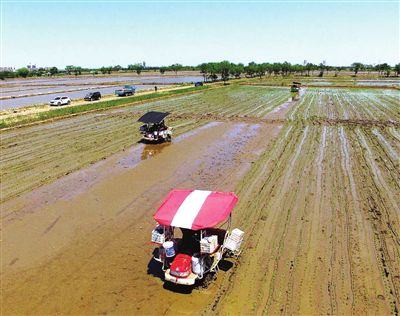 连日来,天津80万亩小站稻插秧工作陆续展开。东丽、宁河等区纷纷采用机械化作业,在降低成本的同时,还能提升水稻秧苗的成活率。(记者 刘玉祥 通讯员 翟鑫彬 摄)