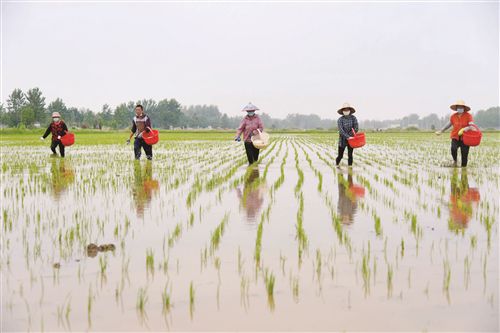 邳州新河镇袁场村村民正在给秧苗施肥。