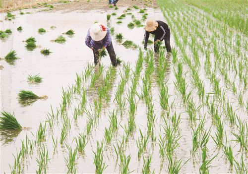 麦收结束后,农民们抢农时、忙插秧,绿油油的稻苗,映衬着农民忙碌的身影,构成一幅生态美图。(孙井贤 陈艳 徐雪林)
