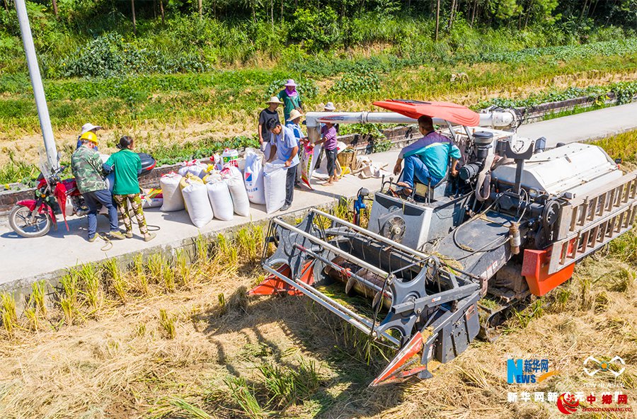农民抓住这晴好天气忙秋收,确保水稻颗粒归仓。新华网发(甘昊旻 摄)