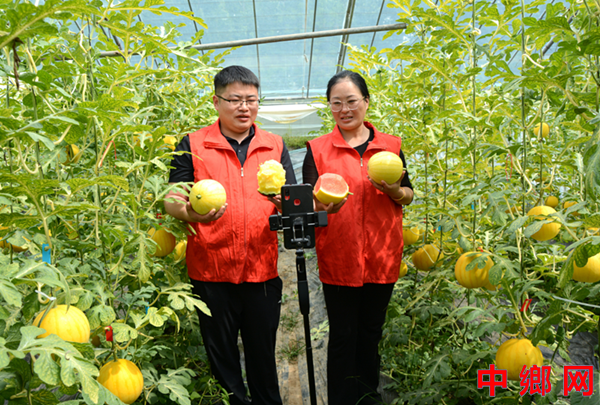 4月22日,河南省内黄县马上乡赵信村的智能大棚产业种植基地内,村大学生、党支部书记吕永康和县直播达人李利娜正在帮助返乡种植能手、学伟种植专业合作社负责人吕学伟向网友推介着当地的特色农产品黄金4号礼品西瓜和彩虹礼品西瓜。