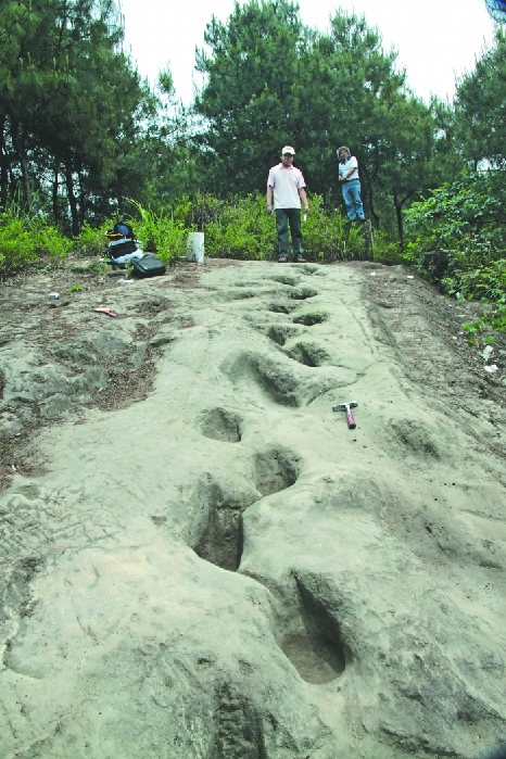 彭光照告诉成都商报记者,这19个足迹平均长度为40公分、宽度为20公分,由此推断出造迹者体长7至8米,这19个足迹都是朝着中线向内偏,也就是通常称的“内八字”,这正是恐龙的行走姿态,明显有别于北美和欧洲“外八字”状的始蜥脚足迹。成都商报记者袁伟 摄影报道