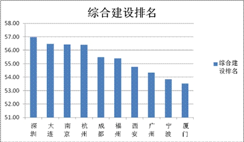省会及副省级城市建设报告综合得分前十名的城市依次为:深圳、大连、南京、杭州、成都、福州、西安、广州、宁波、厦门。(其中,深圳首次晋升第一,厦门首进前十。)
