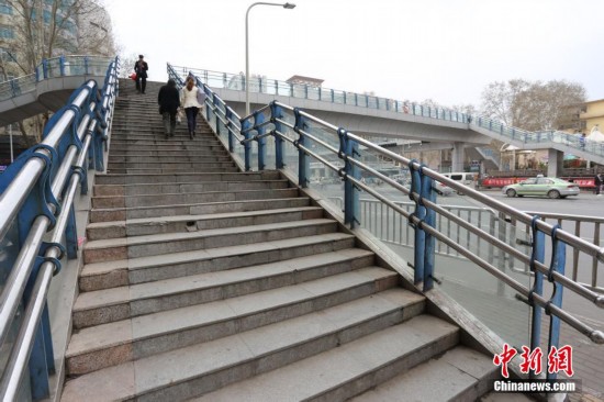 图为3月25日,行人从黄河路天桥上通过。杨正华 摄
