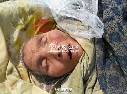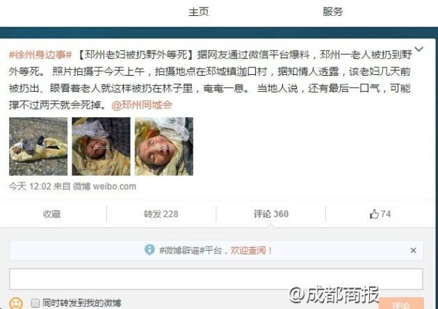 江苏邳州一老人被扔到野外等死,照片拍摄地在邳城镇泇口村。知情人称该老妇几天前被扔出,眼看着就这样被扔在林里,奄奄一息。经成都商报记者调查核实,邳城镇派出所工作人员称确有此事,已经解决。然而具体何事、如何解决,却不愿透露。