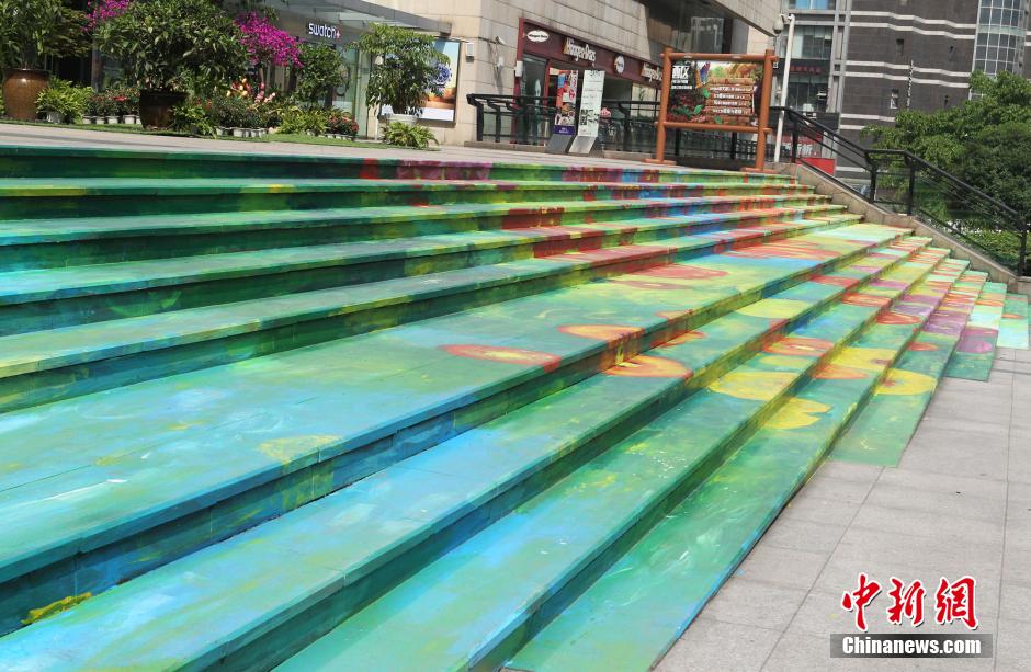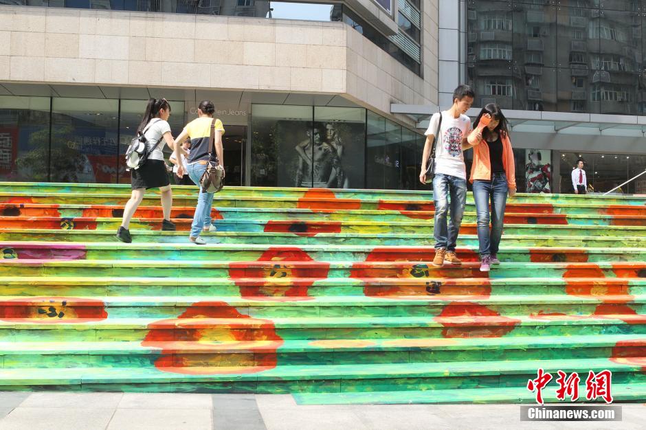 4月16日,重庆杨家坪步行街上现3D涂鸦楼梯,美轮美奂。图为市民走在3D涂鸦阶梯上。周毅 摄