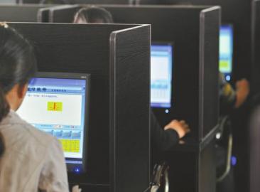 学员们在驾校上电脑考试模拟课。