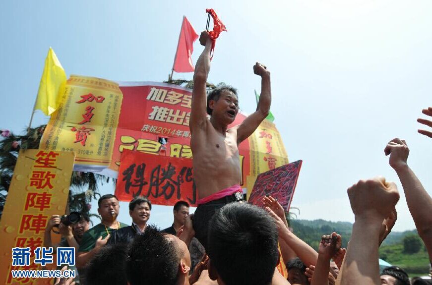 4月21日,在广西三江侗族自治县富禄乡,抢得花炮的队伍呐喊庆祝。