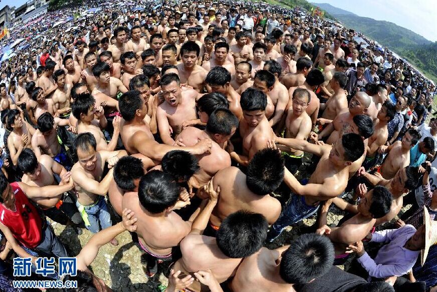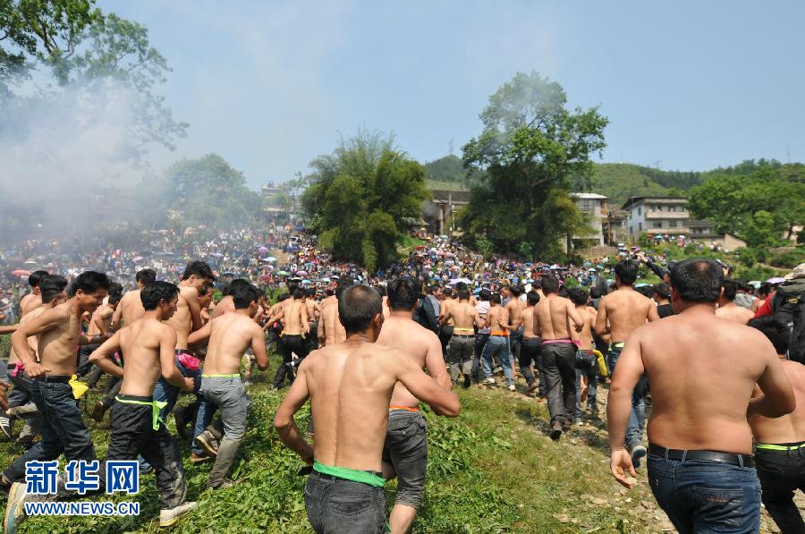 4月21日,众多男子参加广西三江侗族自治县富禄乡的抢花炮活动。