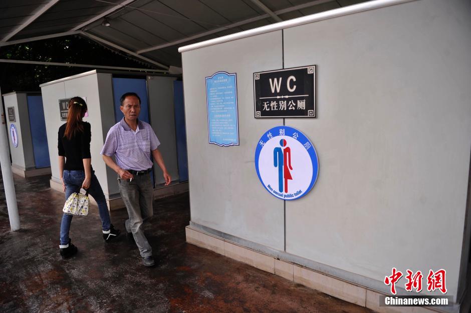 4月24日,重庆洋人街工作人员在公共厕所上挂起“无性别公厕”标识牌。公厕门外有一个醒目红色报警灯,当厕所有人时,该警报灯就会一直闪亮。据洋人街物管介绍,节假日游客众多,男厕经常出现空荡荡,而女厕排起了长龙,希望以这种设计方式能提高公厕的服务水平和利用效率。陈超 摄