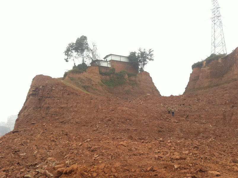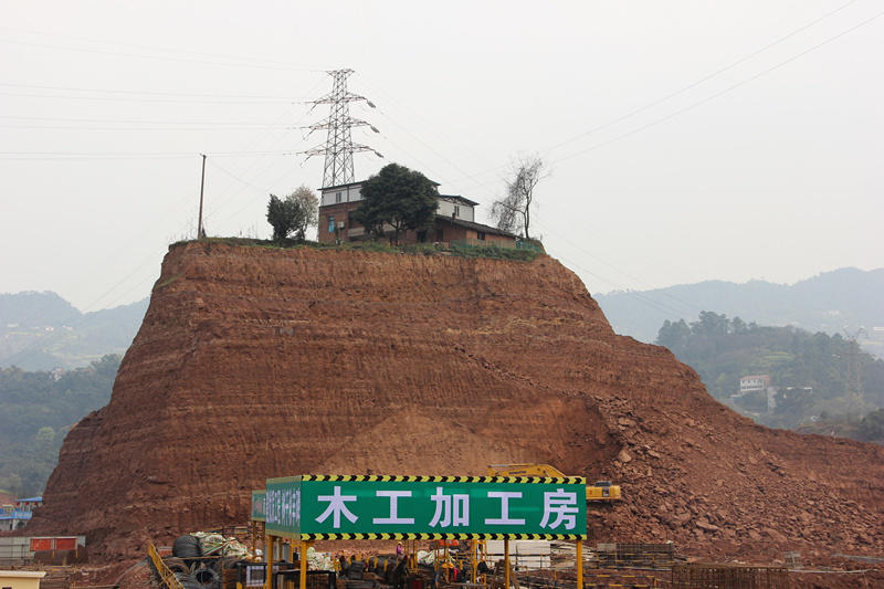 2015年3月9日,四川省宜宾市翠屏区在一大型楼盘工地上特别引人注目,该村于2004年既被宜宾市政府批准征用但十年来一直未实际征用,2014年又重新启动征地程序。由于该户村民与拆迁办就补偿标准无法达成一致,至今未搬迁。