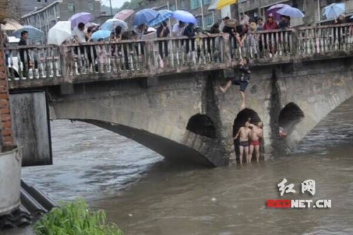获救男子40岁左右,外乡人,在花桥镇打零工,因突发暴雨到桥洞避雨,不料溪水上涨迅速,片刻间已无法自行离开,被困于桥洞。(记者 尹存静)