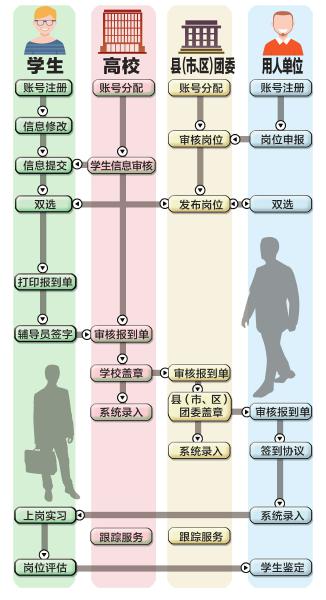 所有实习岗位均通过网络向大学生公布,从5月份起,学生可以通过网站提交个人信息进行注册,6月开始选择实习岗位。