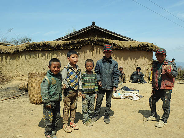 四川省大凉山区美姑县拉木阿觉乡马依村的几名孩子站在村里的一处空地上(3月25日摄)。 新华社记者陈地摄