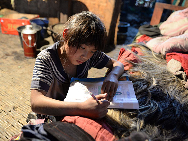 在云南省怒江州福贡县木克基村,一名孩子趴在床上做作业,她的家里没有桌子(3月28日摄)。 新华社记者胡超摄