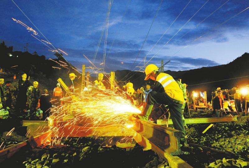 工人们首先用焊枪切断原有的铁路,然后吆喝着号子将原铁路线上每个重达800斤的枕轨挑到一边。另一边,铁轨被机器挑起,数十位工人在工头的带领下,一点一点用撬棍将铁轨往需要接拨的新线方向移动。同时,装填路基的工人也配合着节奏同步工作,只用了半个多小时,宝成线往北京方向的铁轨便接拨成功。