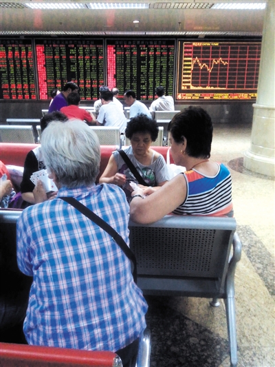 7月2日,东直门一证券交易厅内股民午间休市时在打牌。