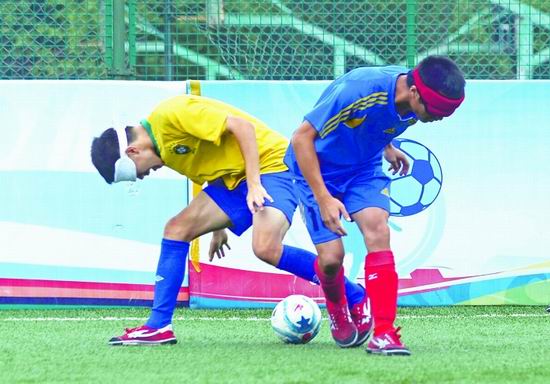 盲人球员踢球,需要佩戴3层眼罩,一是以示公平,保证绝对黑暗环境;二是保护额头,避免受伤。他们使用铃铛足球,踢起来铃铃作响,重量也在普通足球2倍以上。