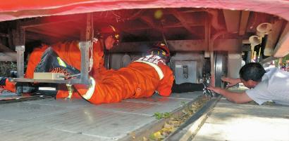 南湖大路消防中队副中队长杜森一边询问事故原因,一边趴在地上观察车底的情况。