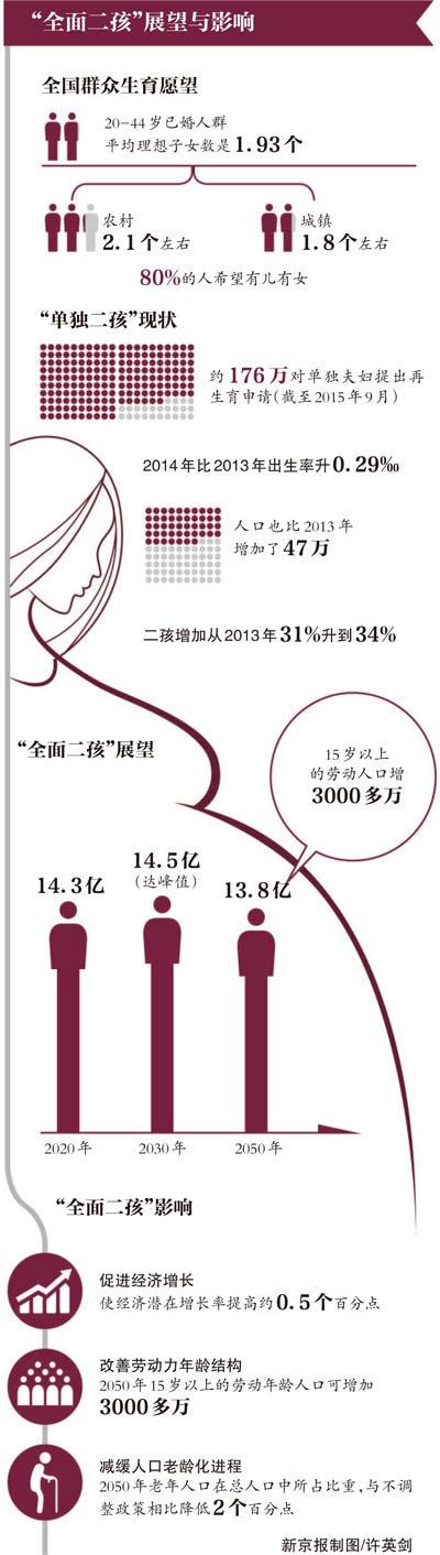 国家卫计委副主任王培安表示,据预测,实施全面二孩政策,2050年可增加3000多万劳动力,劳动力年龄结构有所改善;到2050年老年人口在总人口中所占比重,与不调整政策相比降低2个百分点,将在一定程度上减缓人口老龄化进程。
