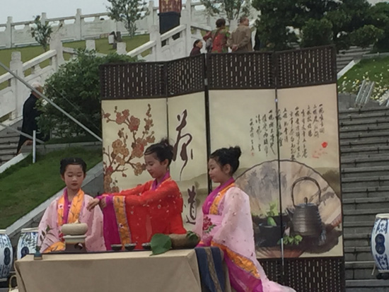 开幕式文艺表演第一篇章《茶颂》,陆羽在教授书童和少儿们吟诵《茶颂》。朗朗的书声、优美的意境,感动了天宫的茶山神女,飘然来到这片人间沃土,拜会陆羽,品味《茶经》。他们以茶为谊,翩翩起舞,演绎一段天上人间的”茶之邂逅”。(本网记者 邓俐摄影)