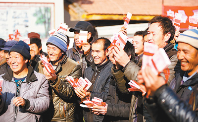 甘肃省宕昌县以“党支部+合作社+贫困户”方式,组建农民专业合作社发展养殖种植业,帮助贫困户脱贫致富。图为宕昌县何家堡乡草坪子村专业养鸡合作社入股农民喜领合作社分红。 |