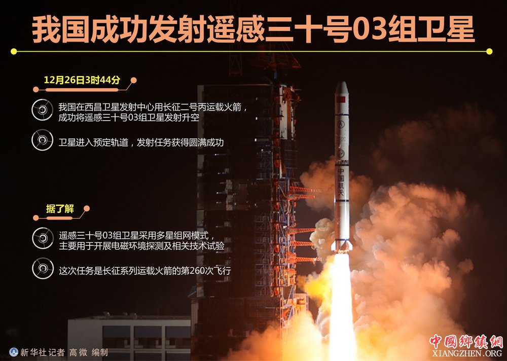 12月26日3时44分,我国在西昌卫星发射中心用长征二号丙运载火箭,成功将遥感三十号03组卫星发射升空,卫星进入预定轨道,发射任务获得圆满成功。据了解,遥感三十号03组卫星采用多星组网模式,主要用于开展电磁环境探测及相关技术试验。
