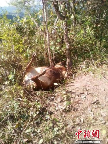 由于当时人比较多,在大家的驱赶下,这头野象最后离开村寨,没有造成人员和财产损失。不过六顺镇团结村的张祖培家就没有那么幸运了。25日,他家放在山上的一头黄牛失踪,直到28日才找到。此时,黄牛已死亡多时。
