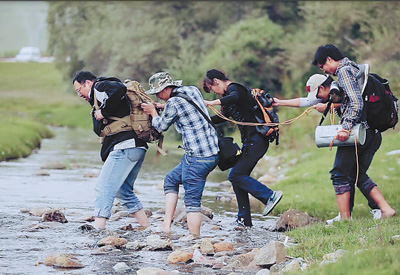 2013年7月,西藏日喀则,钟扬(左一)和学生在野外采样路上。 |