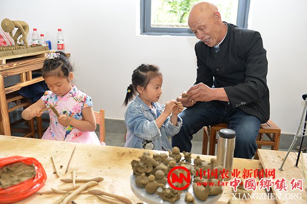 在环境的改善的同时,村民的业余文化生活也更加丰富,大竹园村老人孩子正在制作泥塑。本网记者 戴军 摄