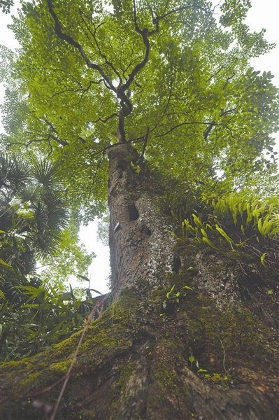 山路曲折,路两旁茂密的树上不时传来各类鸟鸣,正当记者“忘路之远近”的时候,一棵亭亭如盖的香果树就转到了眼前,粗大的树干上还生长着一些寄生植物,随着山风摇曳。