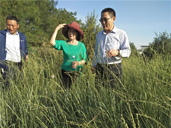 中科院植物研所院士(匡廷云中)与该所研究员、博士生导师刘公社和刘辉博士在北京昌平林草结合利用模式科研基地观摩调研羊草生长情况