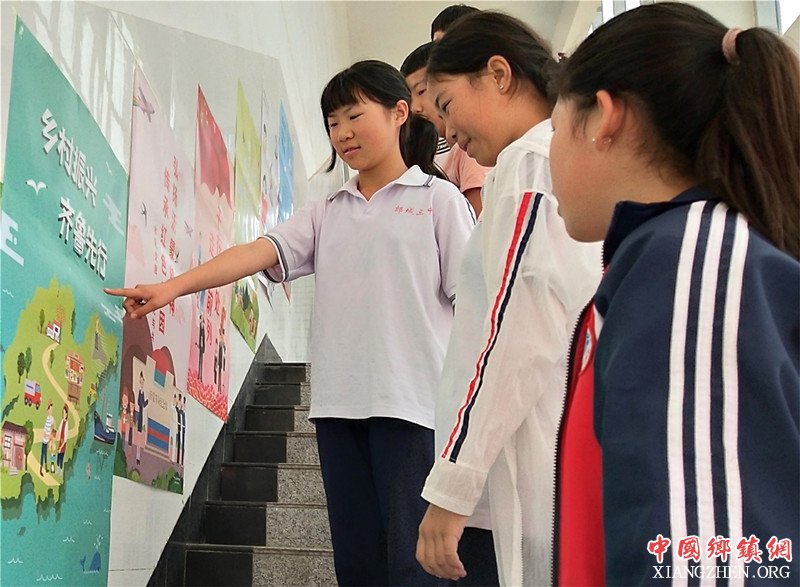 在郯城三中的餐厅墙上,一伙中学生在观看以乡村振兴、齐鲁先行为主题的宣传挂图。