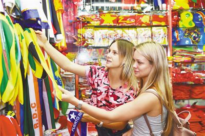 2018俄罗斯“世界杯”带火浙江义乌体育用品。图为6月13日,两名俄罗斯客商在义乌国际商贸城采购球迷用品。 |