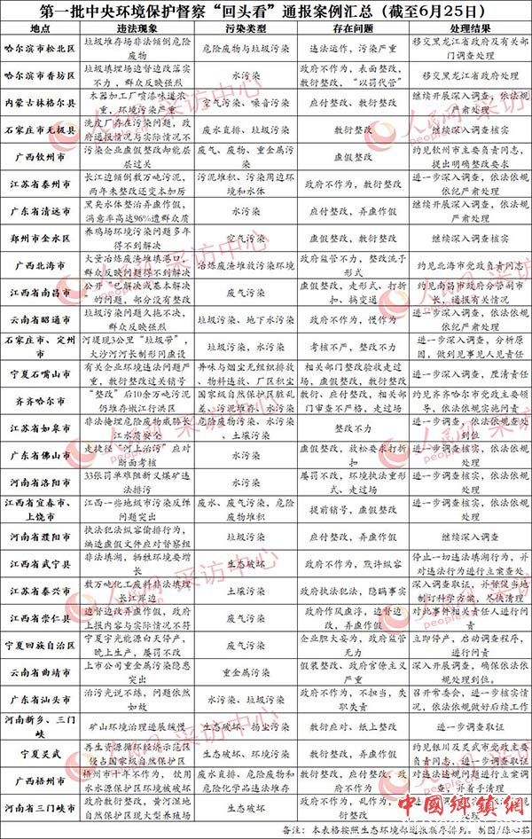 第一批中央环保督查“回头看”通报案例汇总(截至6月25日)。(制图/陈心茹)