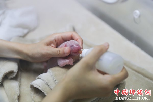 7月2日,在成都大熊猫繁育研究基地,工作人员在给刚出生的龙凤胎大熊猫宝宝其中的一只喂食。