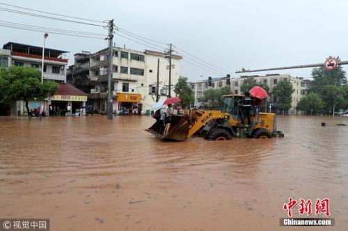 7月6日,江西省抚州市东乡区遭遇特大暴雨袭击,区城管局、水利局出动铲车、皮滑艇等工具,帮助市民渡过积水路段。何江华 摄 图片来源:视觉中国