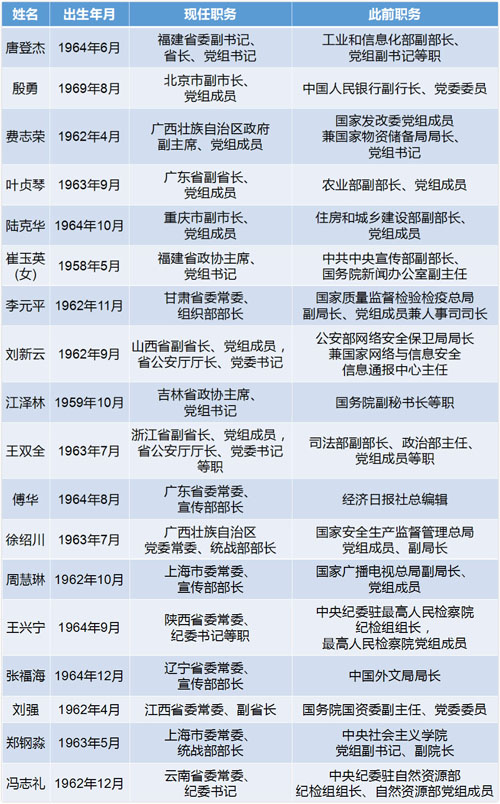 7人担任省级政府副职职务。他们分别是北京市副市长殷勇、广西壮族自治区政府副主席费志荣、广东省副省长叶贞琴、重庆市副市长陆克华、山西省副省长刘新云、浙江省副省长王双全和江西省委常委、副省长刘强。其中,刘新云和王双全两人还担任省公安厅厅长、党委书记职务。